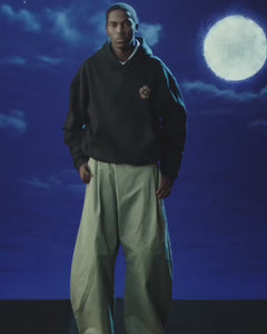 Someone wearing the Sundae School HIGH HORSE LNY HOODIE and wide, light trousers stands beneath a night sky with a full moon and scattered clouds.