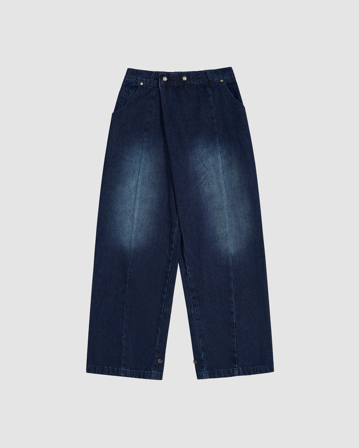 Indigo fade wide-leg hanbok denim pants with high-rise waist and asymmetric front closure featuring silver flower-shaped snap buttons, relaxed fit silhouette, flat lay photography on light gray background