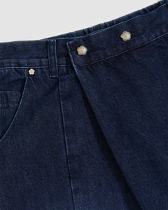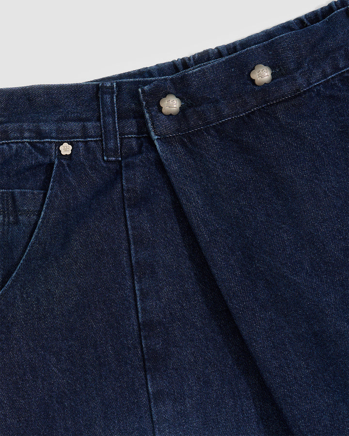 Close-up detail of indigo fade hanbok denim waistband showing silver flower-shaped snap buttons and asymmetric front closure design, highlighting custom hardware and button placement