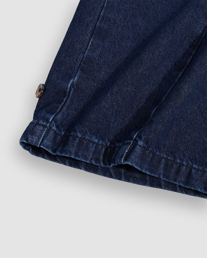 Close-up detail of indigo fade hanbok denim showing partially open zipper closure and silver flower-shaped snap button hardware, highlighting construction details and custom closure system