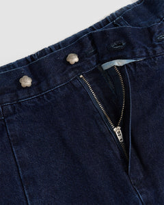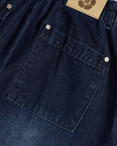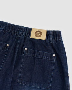 Close-up detail of indigo fade hanbok denim back pocket with silver flower-shaped snap button hardware and Sundae School leather patch visible, highlighting construction details