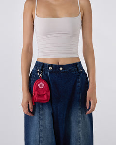 Indigo fade wide-leg hanbok denim pants modeled with white ruched bandeau crop top, white headband, and white disc earrings, red mini backpack accessory attached to waistband, full-length front view against white studio background