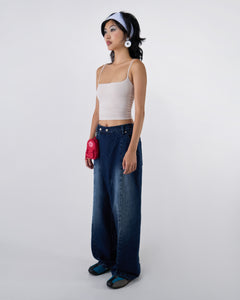 Side profile view of indigo fade wide-leg hanbok denim pants modeled with white ruched bandeau top, white headband and disc earrings, red mini backpack charm, demonstrating relaxed fit silhouette against white studio background