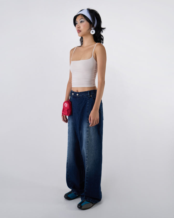 Indigo fade wide-leg hanbok denim pants waistband detail modeled with white ruched bandeau top, showing asymmetric front closure with silver flower snap buttons and red mini backpack charm attached, cropped view against white background