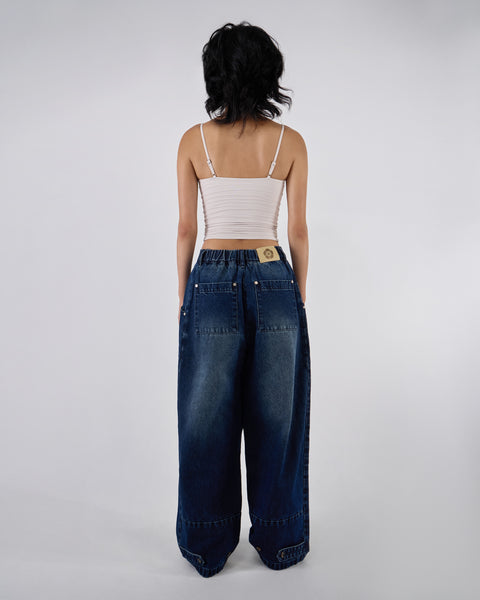 Back view of indigo fade wide-leg hanbok denim pants modeled with white ruched bandeau top, hands on waistband showing Sundae School leather patch and back pocket details against white background