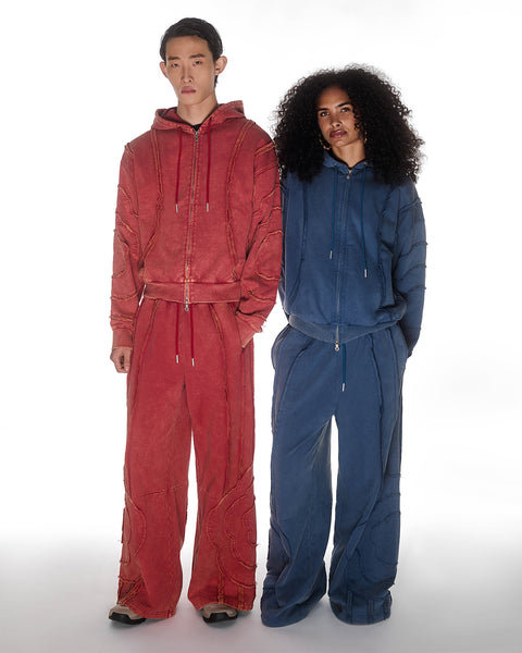 Red and indigo Mochi Haze Paneled Hoodie and Sweatpants sets featuring garment washed cotton with exposed curved seam details, zip-up construction with drawstring hoods, relaxed oversized fit silhouettes, modeled together on light background, shown in front view.