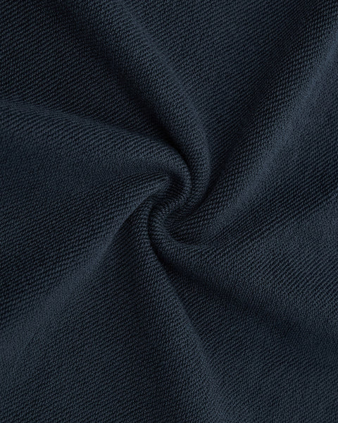Close-up of dark navy blue textured fabric, twisted to reveal soft folds and a subtle swirl pattern—highlighting the smooth weave of Sundae School’s INDIGO WASH HANBOK HOODIE with its signature sleeve stash pocket.
