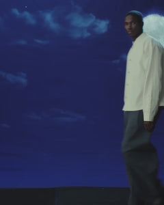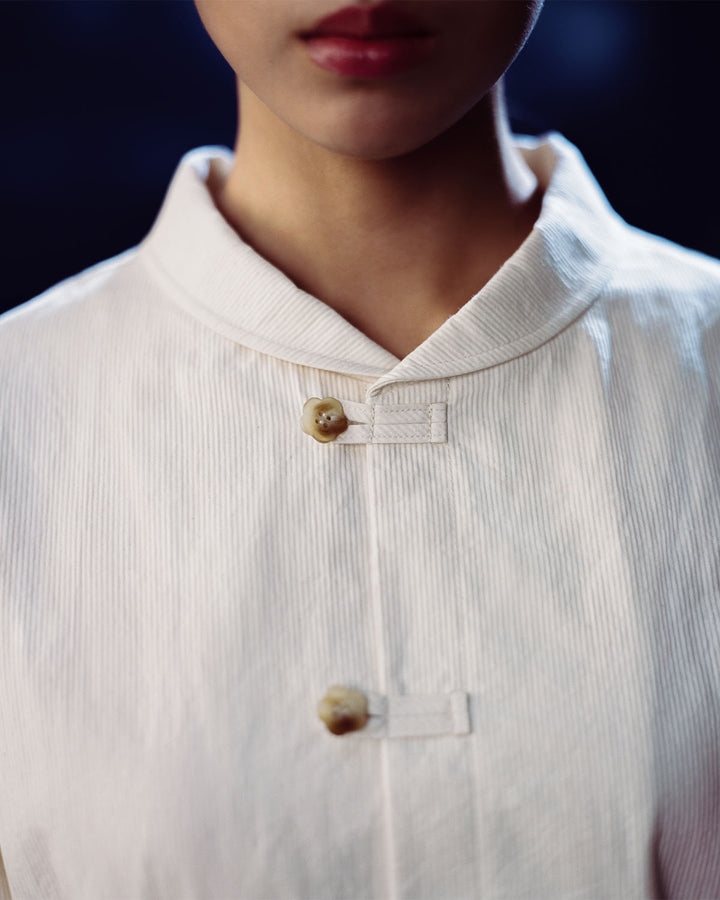 Close-up of a person wearing the IVORY CHINA COLLAR KNOT SHACKET by Sundae School, featuring a relaxed fit, white color, stand-up collar, and two visible buttons. Only the lower face and upper chest are shown against a soft dark blue background.