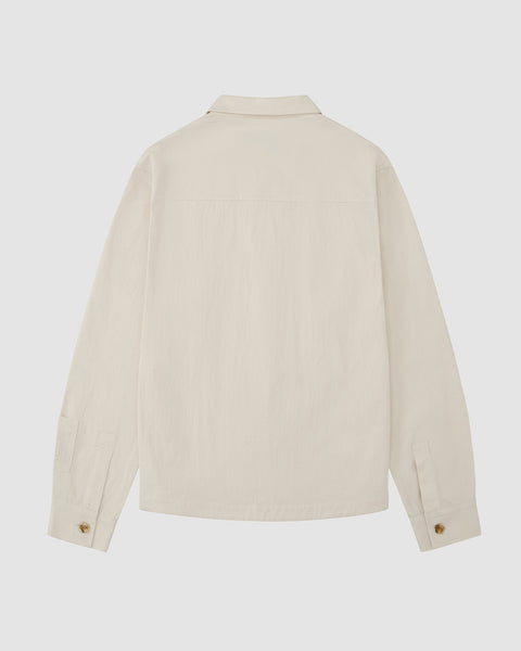 The Sundae School IVORY CHINA COLLAR KNOT SHACKET is a cream, long-sleeve relaxed layer with a mandarin collar and front buttons, made from corded cotton twill and shown laid flat on a light grey background.
