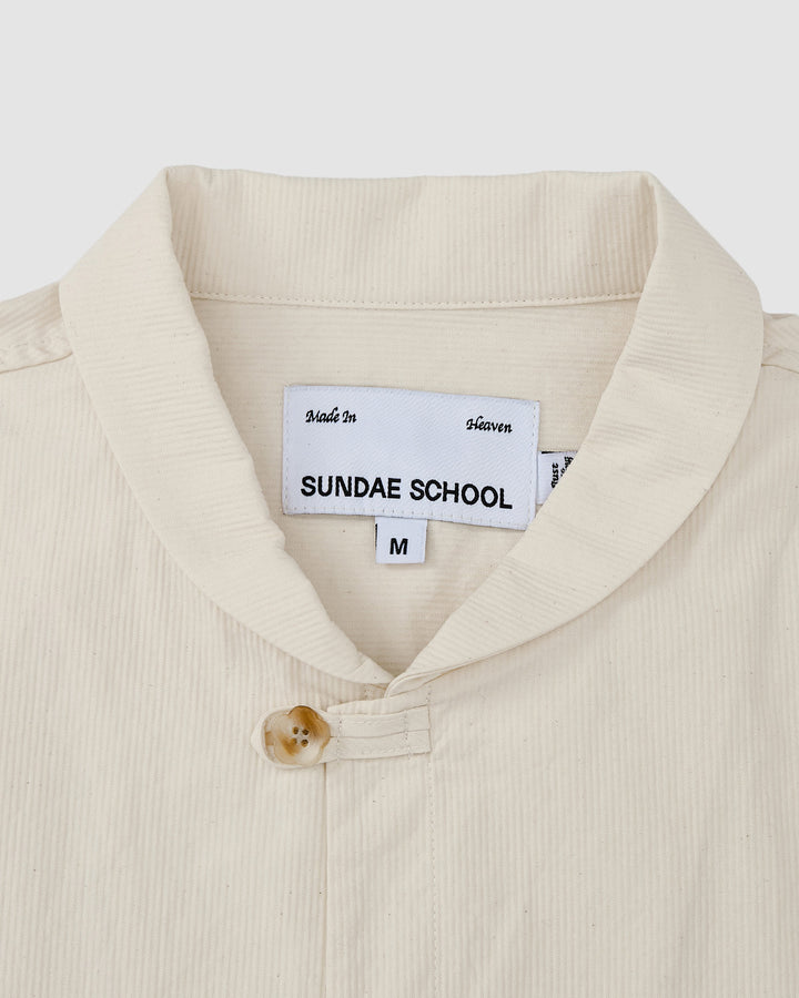 A close-up of the Sundae School IVORY CHINA COLLAR KNOT SHACKET, a cream-colored shirt with a mandarin collar and single button in corded cotton twill. The inner tag shows