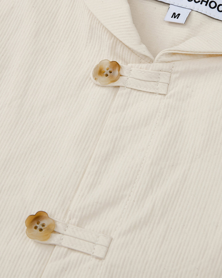 Close-up of Sundae School’s IVORY CHINA COLLAR KNOT SHACKET in corded cotton twill with vertical ribbing, two beige flower-shaped buttons, fabric loops at the collar, and a partial size M tag visible.