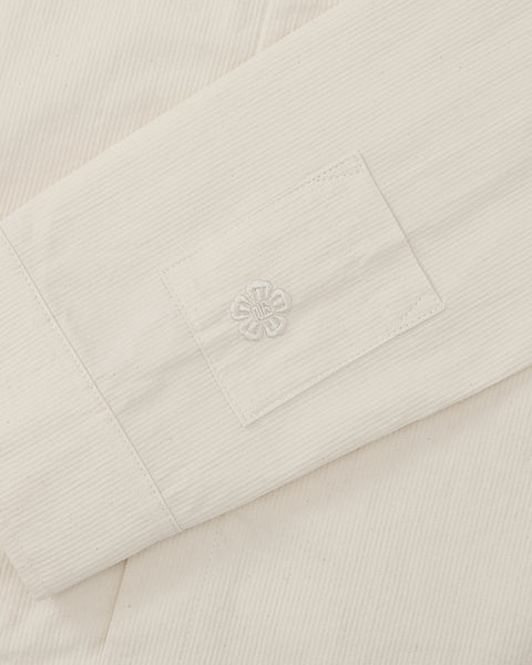 A close-up of a person wearing the Sundae School IVORY CHINA COLLAR KNOT SHACKET, a light corded cotton twill shirt with beige buttons and a sleeve pocket featuring an embroidered white flower.