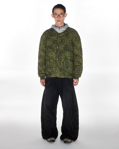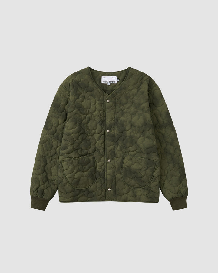 Close-up of olive green MATCHA MOCHI QUILTED MILITARY LINER by Sundae School, featuring a curved-edge pocket and floral-patterned stitching—ideal as a transitional weather layer inspired by classic Korean military jackets.