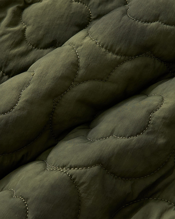 Close-up of Sundae School's MATCHA MOCHI QUILTED MILITARY LINER shows soft, slightly shiny olive green fabric with cloud-like stitching and gentle folds—ideal for a transitional weather jacket.
