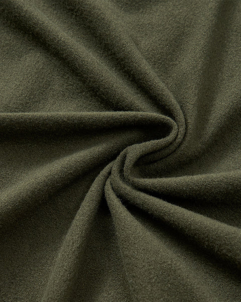 Close-up of olive green MATCHA MOCHI QUILTED MILITARY LINER fabric by Sundae School, featuring a soft, fuzzy texture with gentle folds and a swirling pattern gathered at the center.