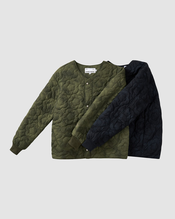 Two Sundae School BLACK MOCHI QUILTED MILITARY LINER jackets, in olive green and black, are laid flat on a light gray background. Both feature snap buttons and round necklines, inspired by a Korean military jacket style.