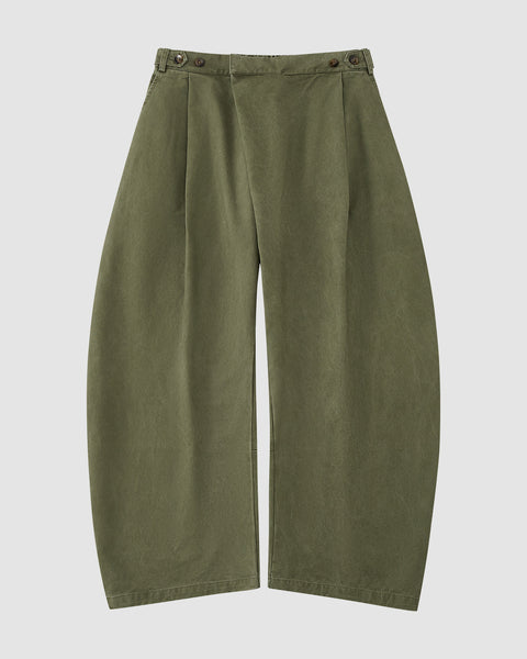 Sundae School's OLIVE HANBOK CHINO PANTS feature a loose fit, pleats, high waist, and buttoned waistband for a hanbok-inspired silhouette, displayed flat against a light background.