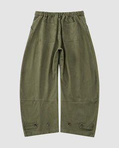 The OLIVE HANBOK CHINO PANTS by Sundae School feature a hanbok-inspired silhouette, elastic waistband, large back pockets, and adjustable buttoned cuffs. Displayed on a plain light gray background.