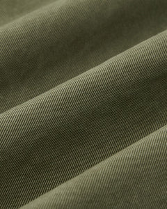 Close-up of olive green, ribbed fabric with diagonal lines and soft folds highlights the unique texture—ideal for Sundae School’s OLIVE HANBOK CHINO PANTS featuring a hanbok-inspired silhouette.