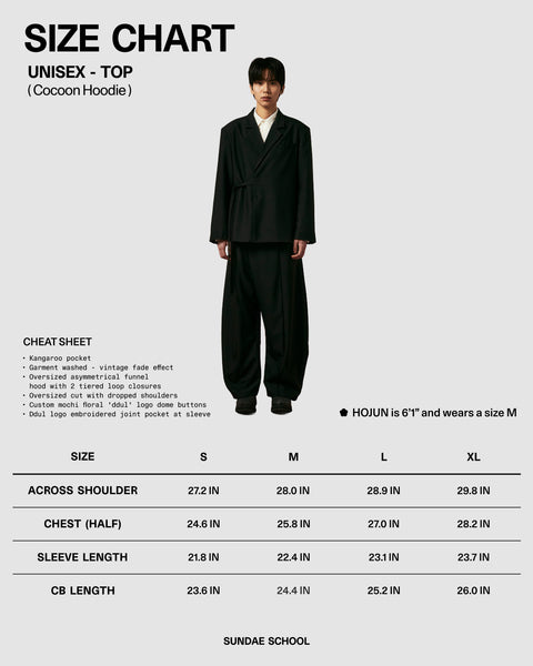 A size chart for the Sundae School SKY BLUE COCOON HOODIE shows a model in a loose, oversized hoodie. It lists shoulder, half chest, sleeve, and center back lengths for S, M, L, and XL sizes.