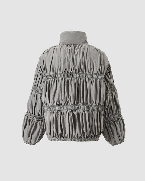 The Sundae School SMOKE PLEATED DUVET PUFFER is a light gray zip-up jacket with a high collar, all-over pleated ruching for texture and volume, long sleeves, and an elastic hem.