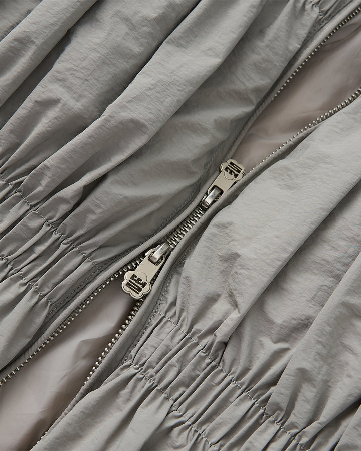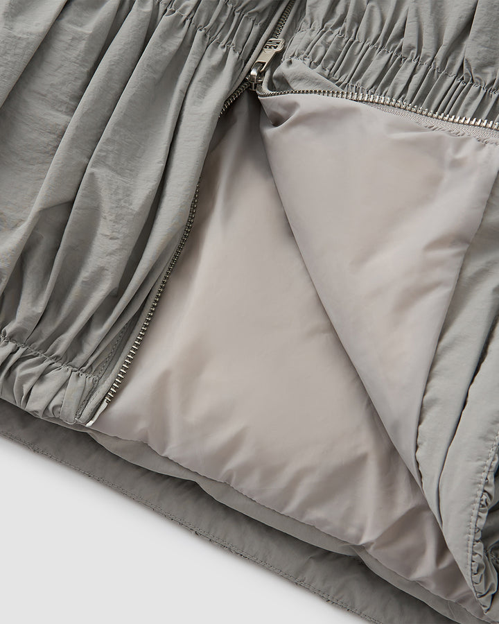 Close-up of Sundae School's SMOKE PLEATED DUVET PUFFER in light gray, showing the smooth interior lining, partially opened zipper, and gathered elastic seam details.
