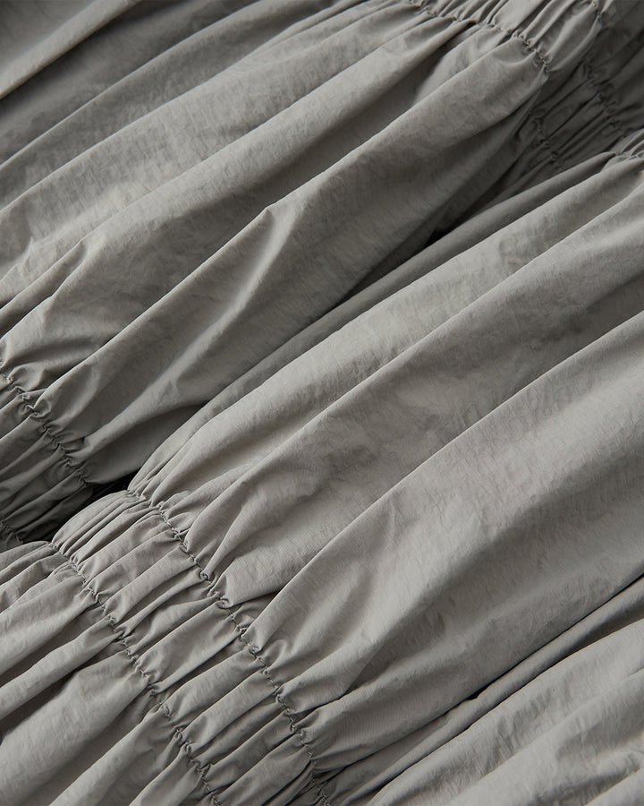 Close-up of Sundae School’s SMOKE PLEATED DUVET PUFFER shows light gray fabric with gathered, ruched sections and elasticized horizontal lines, creating soft, puffy folds for a cozy, stylish look.