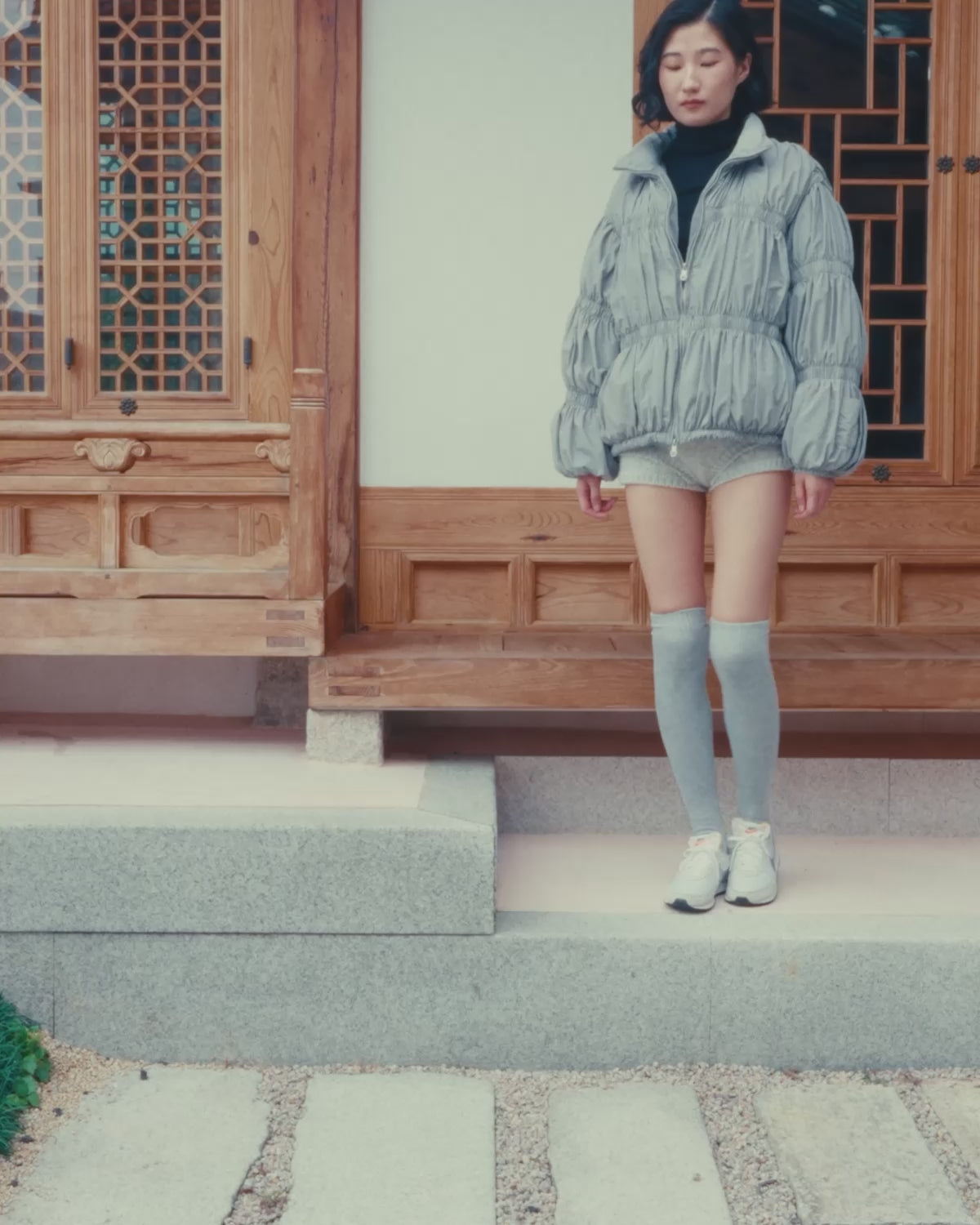 Asymmetric tie and zipper closure inspired by the traditional Korean hanbok for silent luxury.