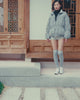 A person with long dark hair and black boots, holding a gray handbag, stands facing an elevator wearing the Sundae School SMOKE PLEATED DUVET PUFFER, a matching gray pleated skirt, and metallic doors reflect their image.
