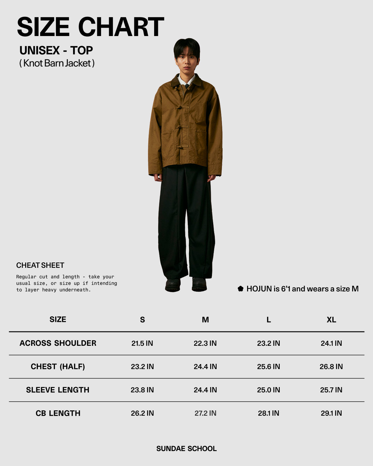 • Hojun is 6'0" and wearing Tan Knot Barn Jacket M