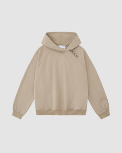 A close-up of a person wearing the Sundae School TAUPE HANBOK HOODIE, featuring an asymmetric hood closure and three silver domed buttons fastened with loops on the shoulder. The background is blurred in dark blue tones.
