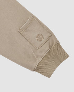 The TAUPE HANBOK HOODIE by Sundae School features beige long sleeves with ribbed knit cuffs and a signature rectangular sleeve stash pocket above the cuff, adorned with an embroidered floral or geometric emblem.