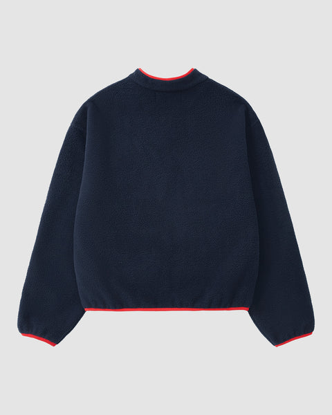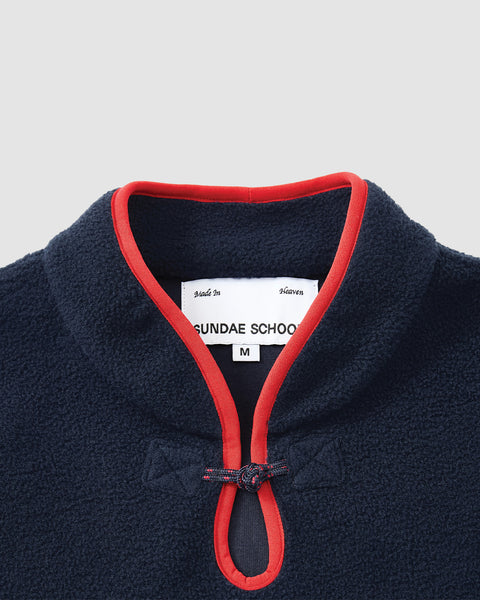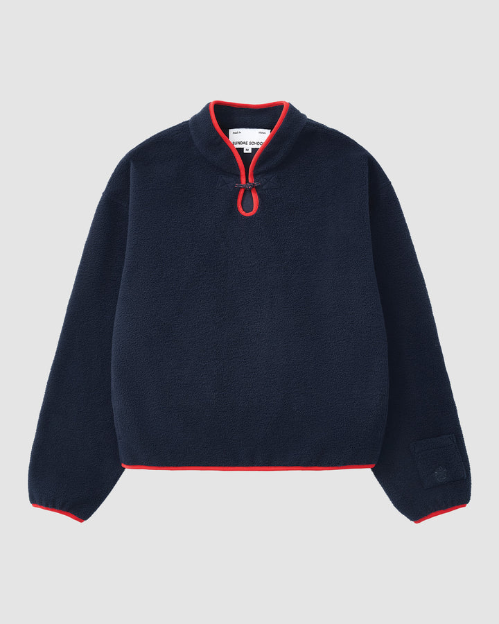 The NAVY TEARDROP KNOT FLEECE by Sundae School features a cozy navy fleece with long sleeves, a high collar, front half-zip with red trim, and red accents on the cuffs and hem.
